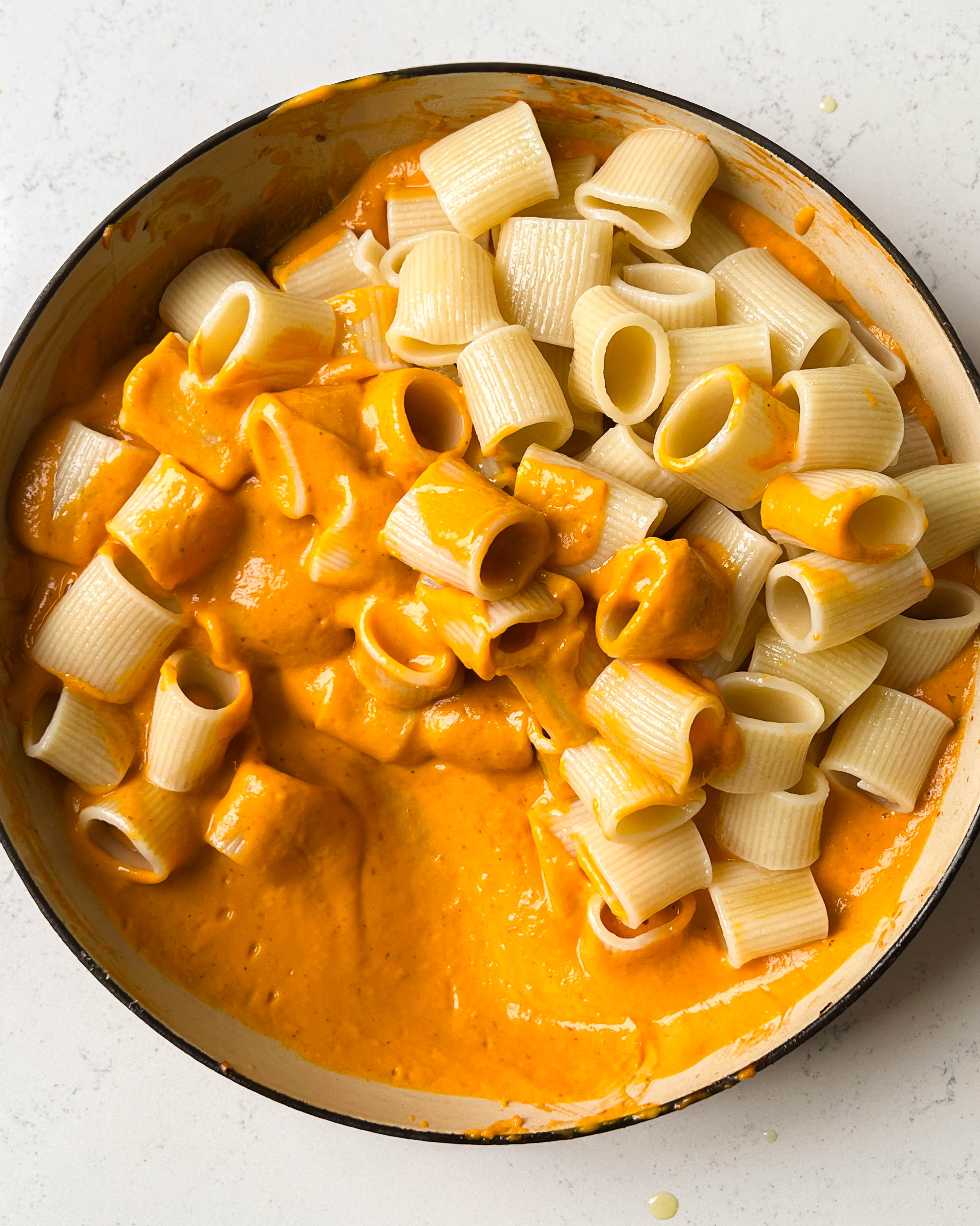 - Finish the pasta. Add the blended sauce back to the pan along with the cooked pasta and stir to combine over low heat, using additional pasta water as needed to thin the sauce. Taste and adjust for salt.