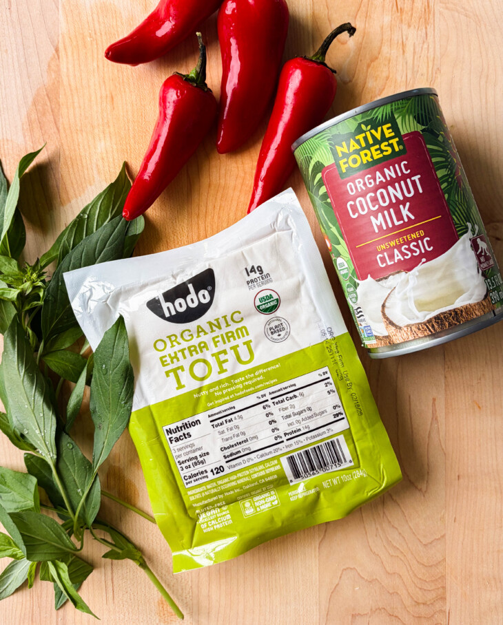 - Simmer and serve. Dump the curry back into your pan, along with the chopped carrots and crispy tofu. Let simmer, covered, for 15 minutes on medium heat, or until the carrots are tender. Taste and adjust for salt. Turn off the heat and stir through the Thai basil leaves. Serve with white rice, and garnish with thinly sliced Fresno peppers and extra Thai basil leaves.