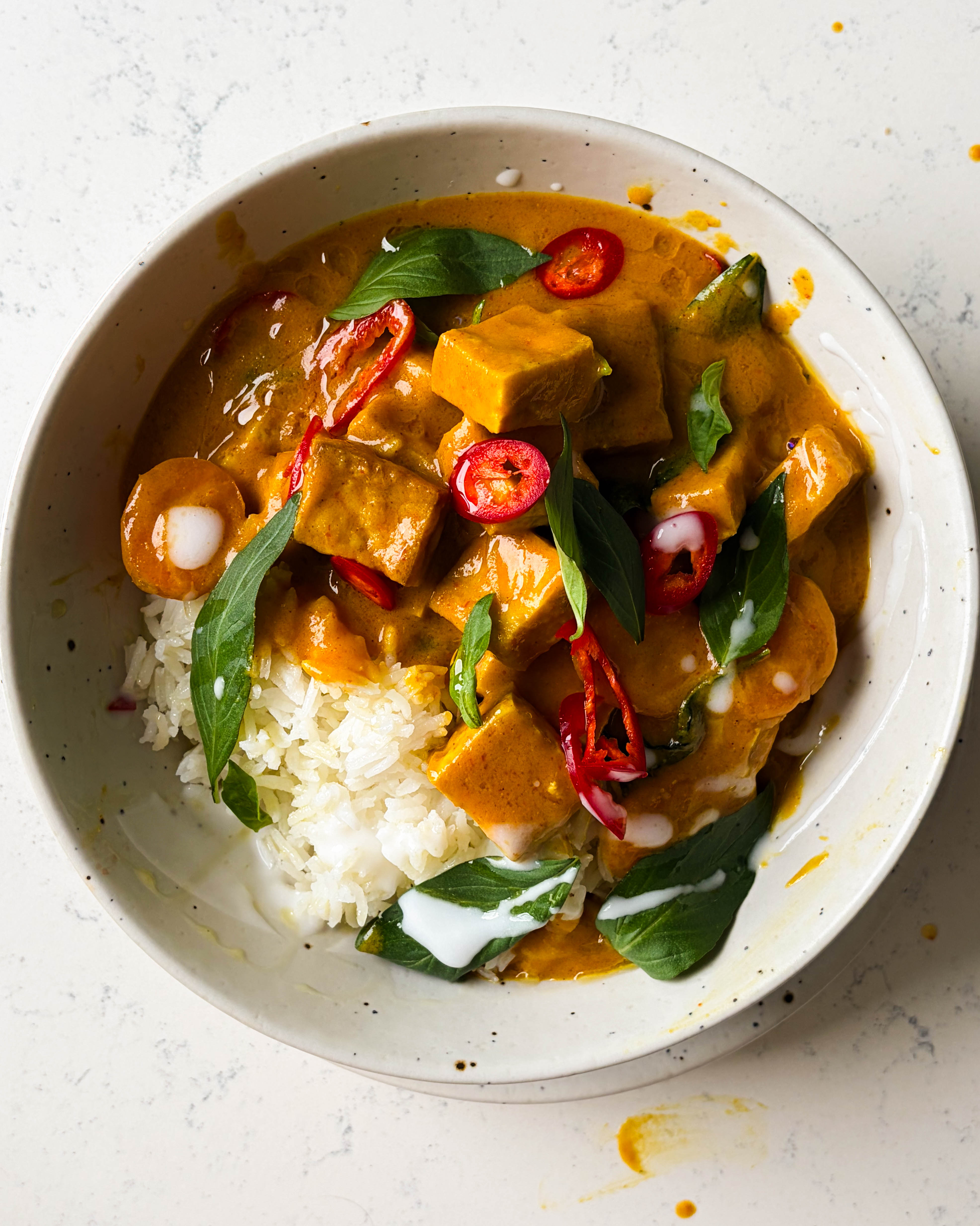 Dump the curry into your pan, along with the chopped carrots and crispy tofu. Let simmer, covered, for 15 minutes on medium heat, or until the carrots are tender. Taste and adjust for salt. Turn off the heat and stir through the Thai basil leaves. Serve with white rice, and garnish with thinly sliced Fresno peppers and extra Thai basil leaves.